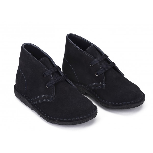 Polacchino unisex sopra la caviglia in camoscio blu navy con stringa blu, fodera in pelle naturale blu, forma anatomica e sottopiede imbottito, intersuola di vero cuoio rigenerato e suola di para naturale ambra con sfilo nero. Disponibile dal numero 24 al 43.