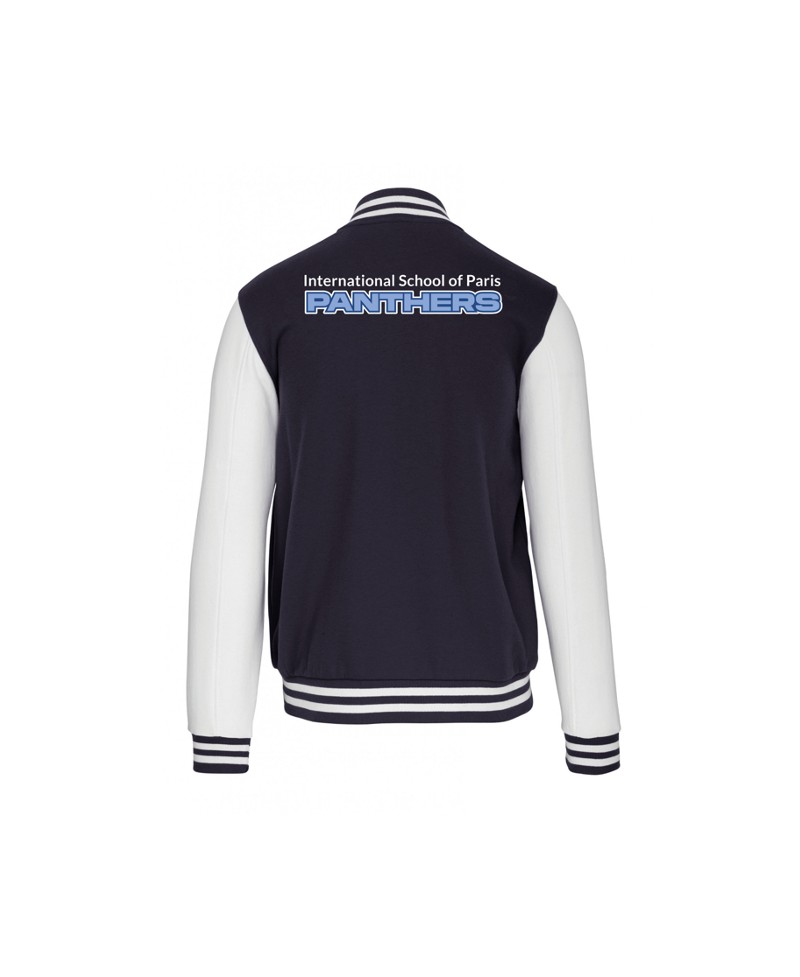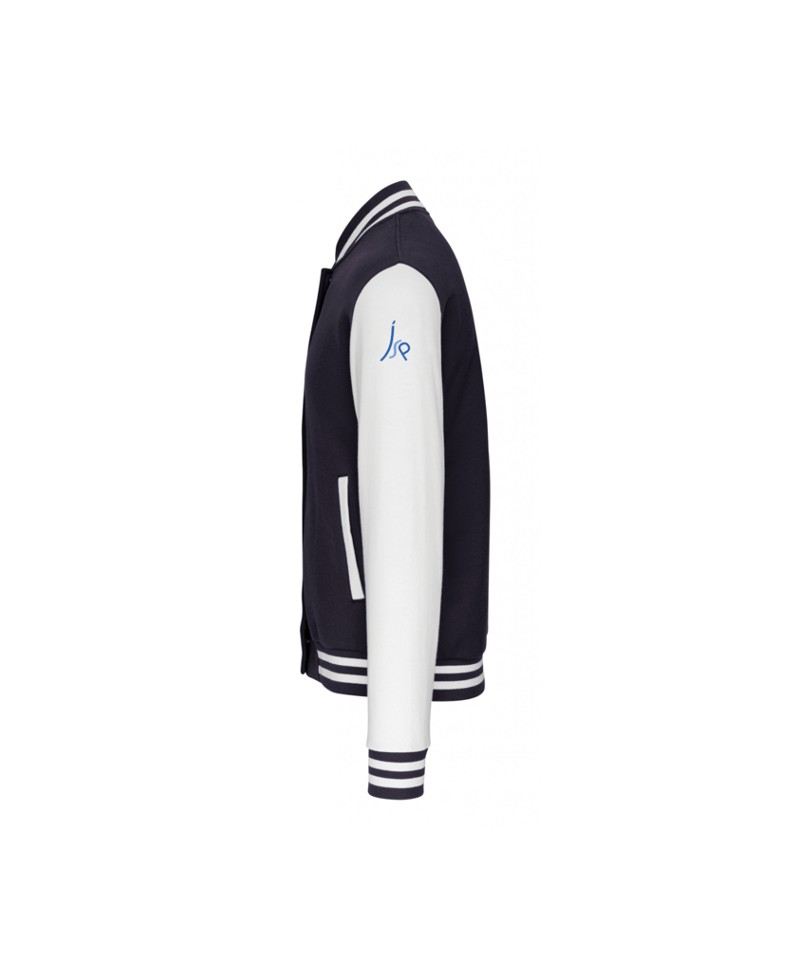 Navy blue with white sleeves, 70% cotton 30% polyester, machine washable at 30°.