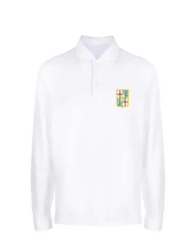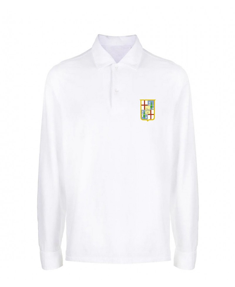 White with the school crest, 100% cotton, machine washable at 30°. No dryer.