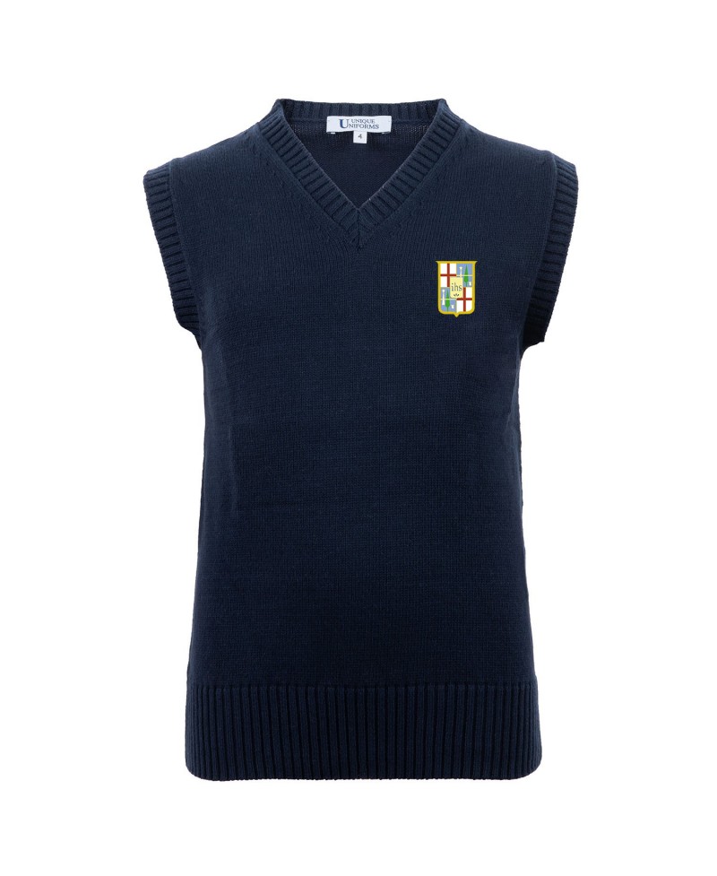 Navy blue with the school crest, 100% cotton, machine washable at 30°. No dryer.