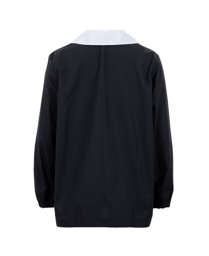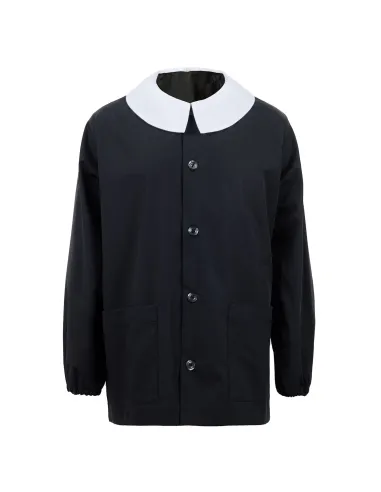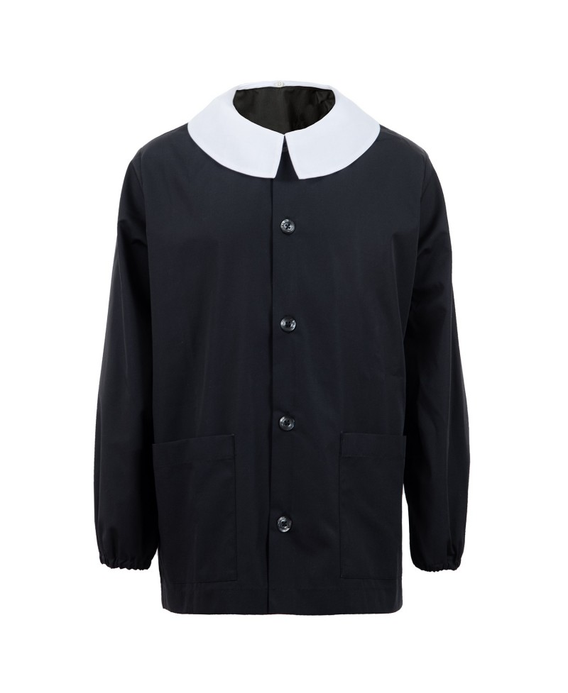 Black with white removable collar, popeline 65% cotton 35% Polyester, machine washable at 40°.