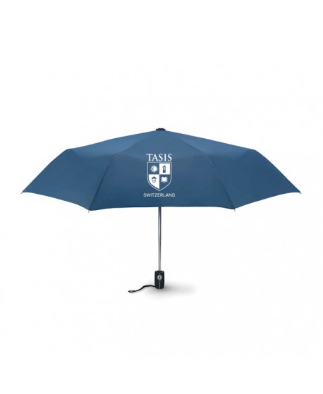 Ombrello deluxe automatico blu da 21'' in 190T. Struttura in acciaio placcata zinco. Nervature nere con due sezione in fibra di vetro e punte in metallo cromato. Manico nero con doming. 3 sezioni di chiusura. In sacchetto abbinato. Chiusura automatica.
