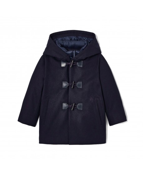 Giacca Montgomery in 100% lana con fodera interna in nylon trapuntato, chiusura con zip e alamari.