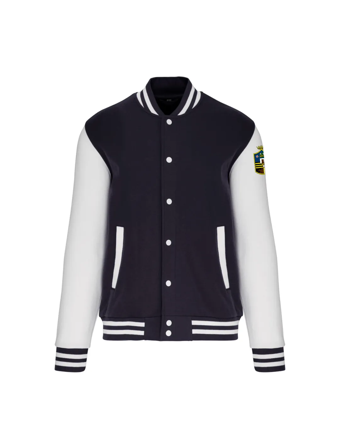 Felpa stile baseball blu navy con maniche a contrasto bianche, 80% cotone 20% poliestere, lavabile in lavatrice a 30°