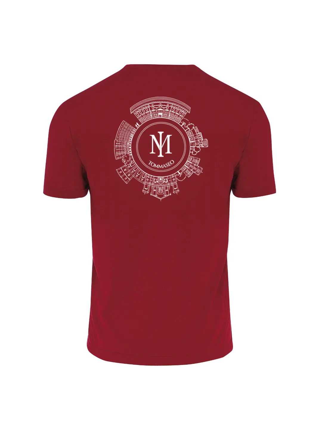T-shirt sportiva maschile burgundy, 100% poliestere, anica a giro, collo a giro con parasudore interno elastico, cuciture con copertura a tre aghi in contrasto, inserti laterali per una migliore vestibilità