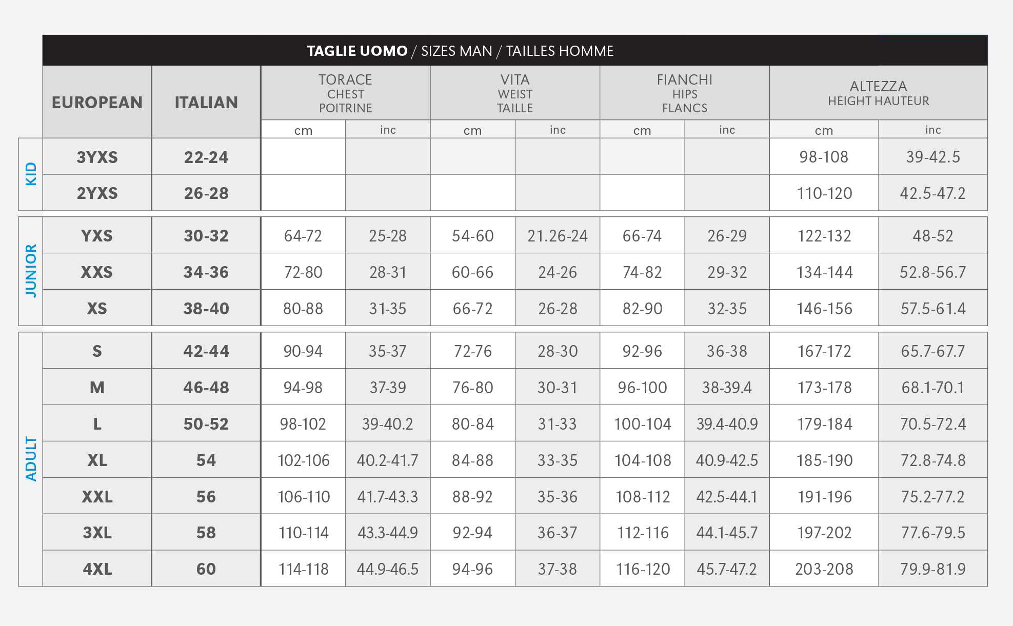 La tabella seguente fornisce le misure corporee corrispondenti alle nostre taglie di abbigliamento.