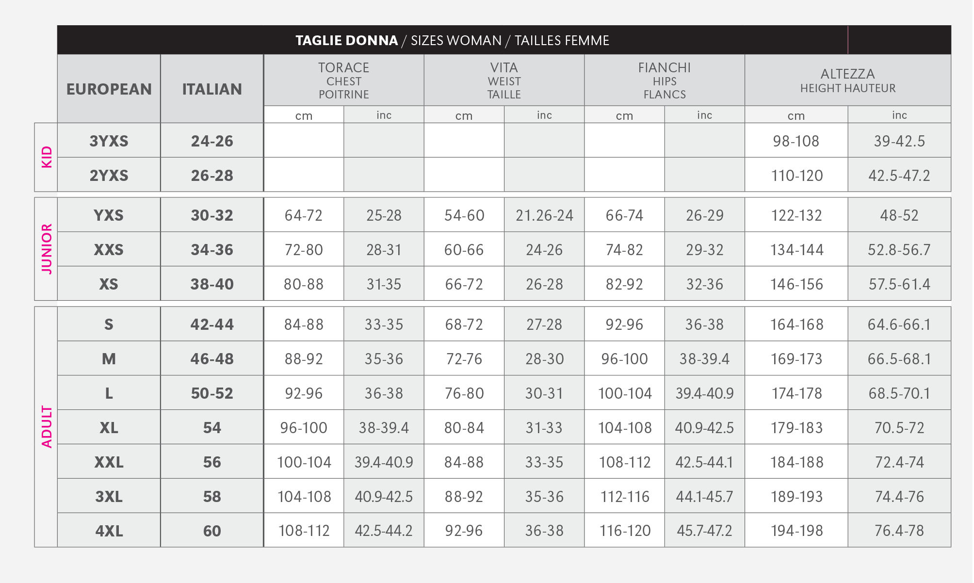 Tabella delle taglie Donna