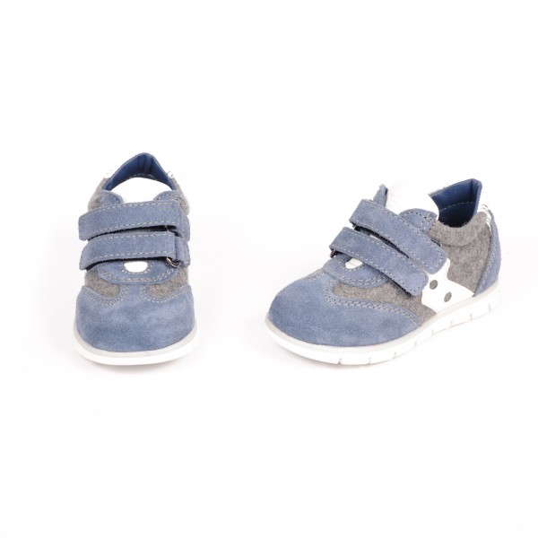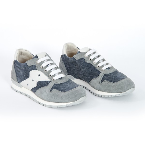 Camoscio grigio e tessuto antracite. Dettagli in pelle bianca. Sperone e punta rinforzati, plantarino anatomico imbottito. Fino al numero 29 sarà disponibile con chiusura in velcro.