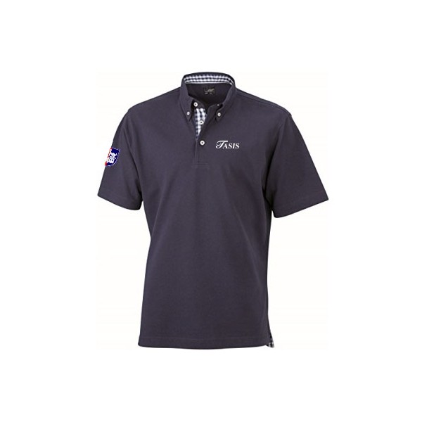Button-down polo shirt with fashionable check inset, fine classic piqué fabric, ready-made button-down collar, check trimming on collar band, inside of button placket and side slits, 3 buttons in contrasting color, half-moon in matching color.