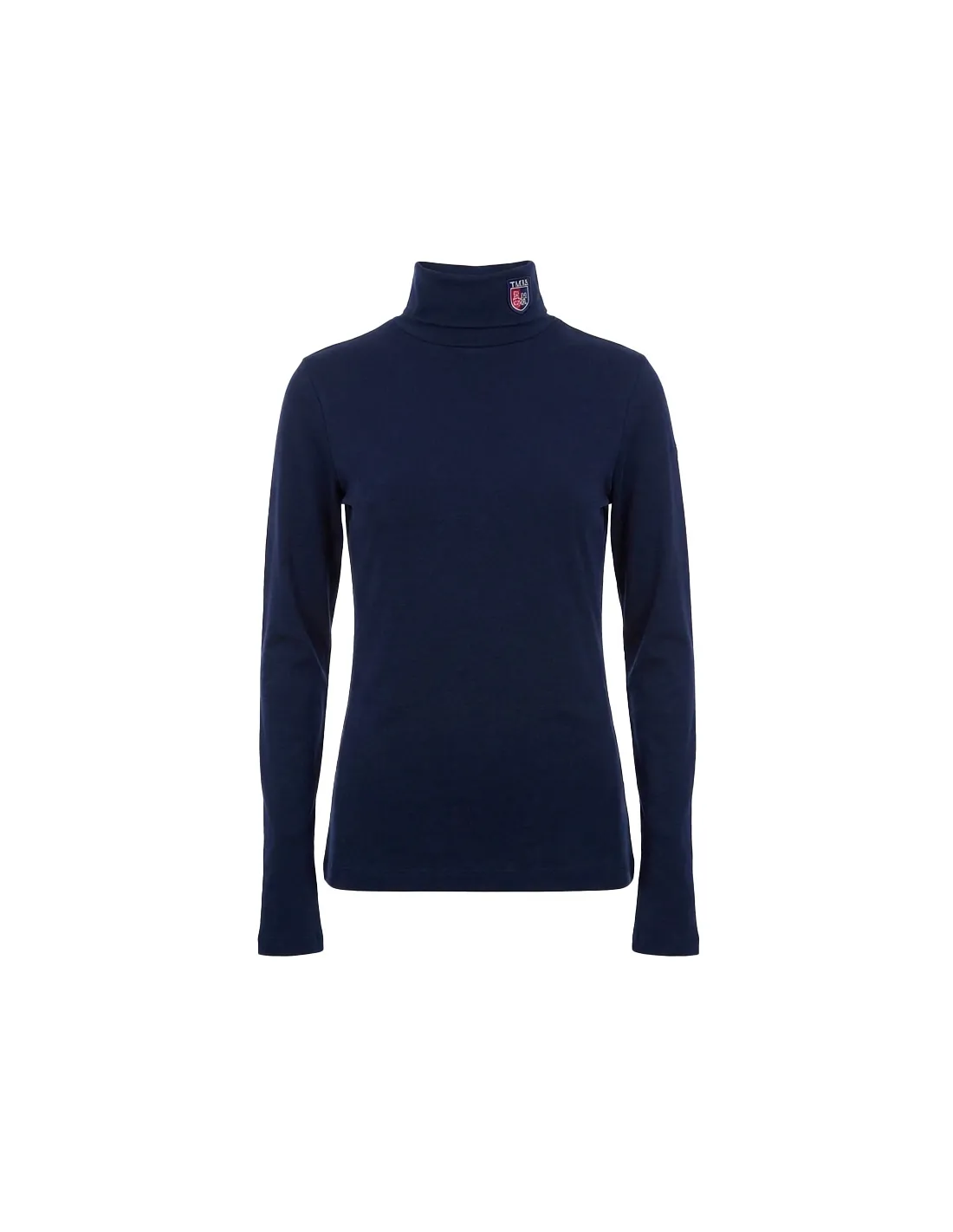 Long sleeved navy blue turtleneck in cotton jersey with crest.